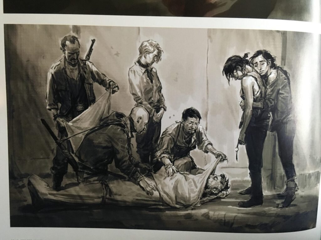 Por otro lado, el cuerpo de Joel arrastrado por el suelo con los caballos, para llevarle a Jackson y poderle dar la sepultura que merece, podría ser también referencia a otro de los artes que hay en las mismas páginas. Donde se ve a gente de Jackson envolviendo a Joel con una especie de telas, lo mismo que podemos ver en la serie.
