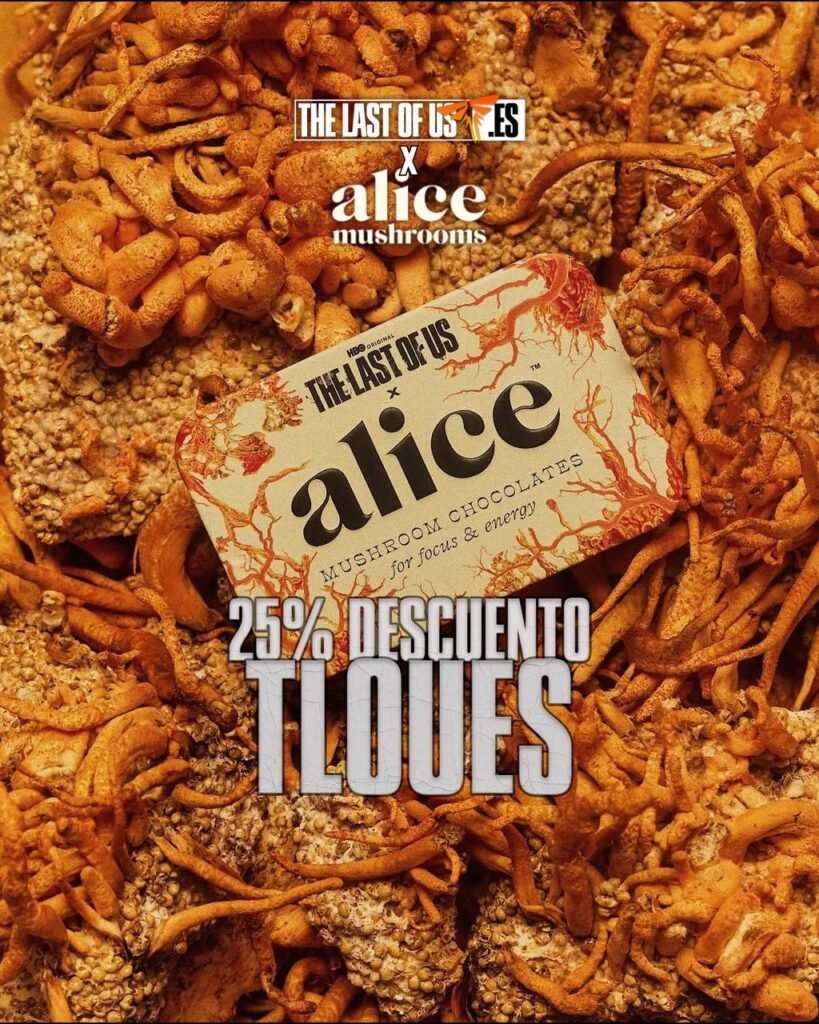 Las dos láminas de chocolate, que equivalen a 16 dosis de chocolate, vienen dentro de un packaging de lo más exclusivo: una lata diseñada con el característico efecto de los zarcillos del cordyceps con el logo de The Last Of Us y Alice Mushrooms y el lema ‘Chocolate de hongos, para la concentración y la energía’. Cuesta 29 dólares (21,75 si se aplica el descuento con el código TLOUES).